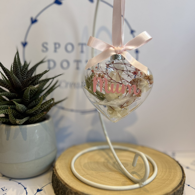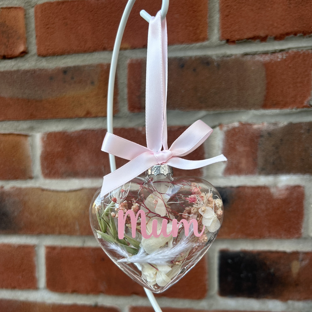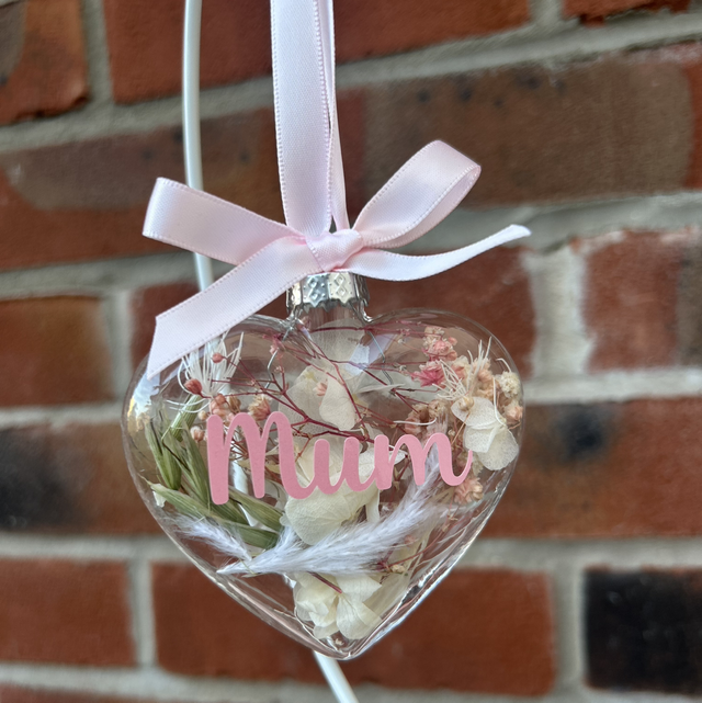 This heart-shaped glass bauble is a perfect gift for Mother's Day. The bauble contains artificial flowers that are finished with a pink satin ribbon, making it a beautiful and thoughtful present. The flowers are placed in the heart at random, adding an element of surprise and uniqueness to the gift. However, the flowers may differ slightly from the photograph, but they are all the same flowers in terms of colors and other features.